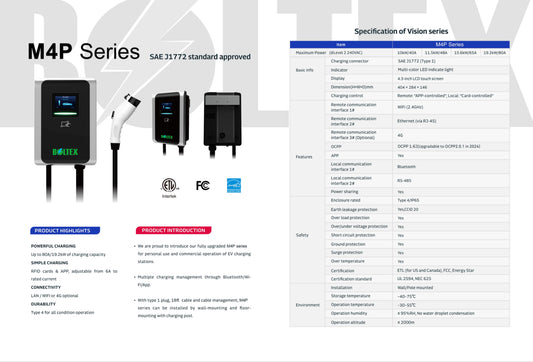 Our M4P, delivering up to 80A / 19.2kW of capacity to ensure rapid and efficient EV charging. It features user-friendly operation with simple RFID card and mobile app functionality, and offers adjustable output from 6A to the rated maximum to meet diverse needs. Advanced connectivity options, including LAN, WiFi, and optional 4G, enable seamless integration and remote monitoring. Built for exceptional durability, our charger has a Type 4 rating, providing robust protection against environmental factors.